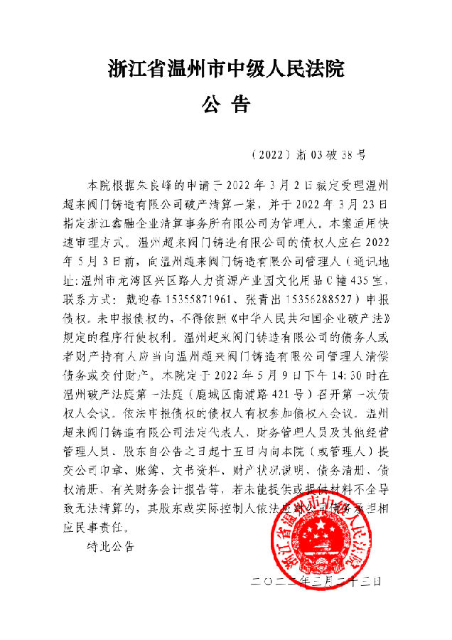 溫州超來閥門鑄造有限公司破產清算案公告