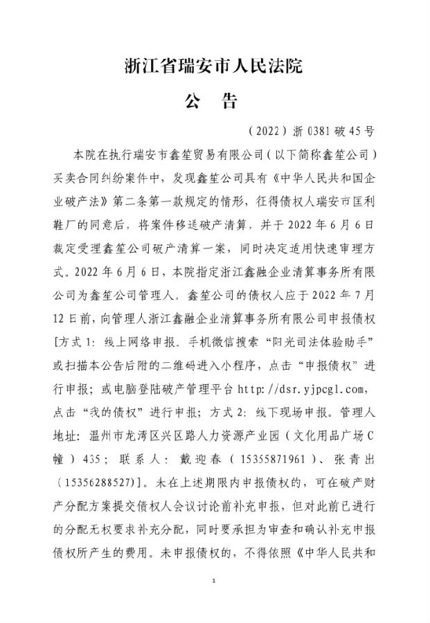 瑞安市鑫笙貿易有限公司破產清算案公告