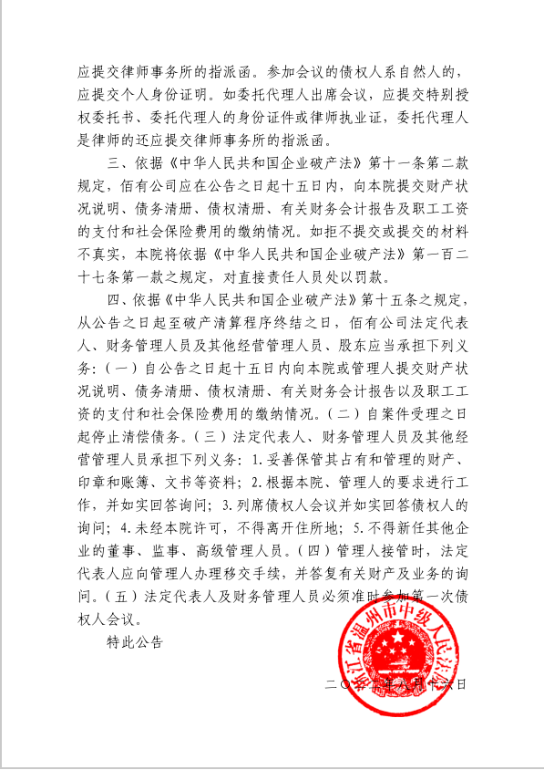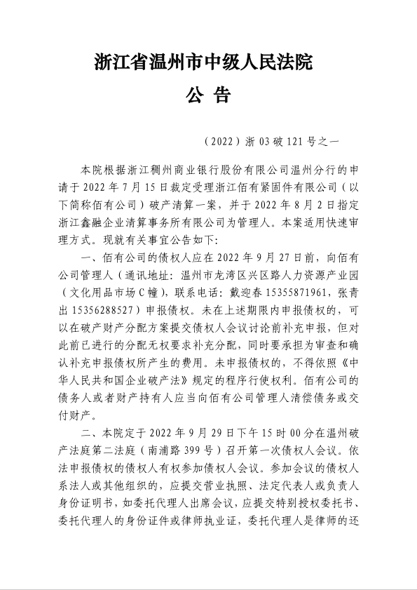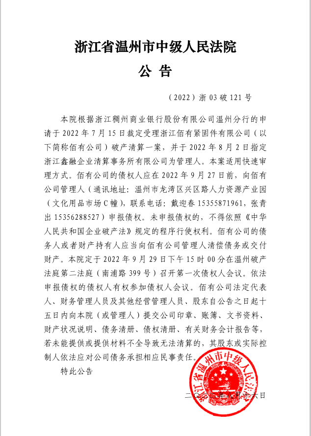 浙江佰有緊固件有限公司破產清算案公告