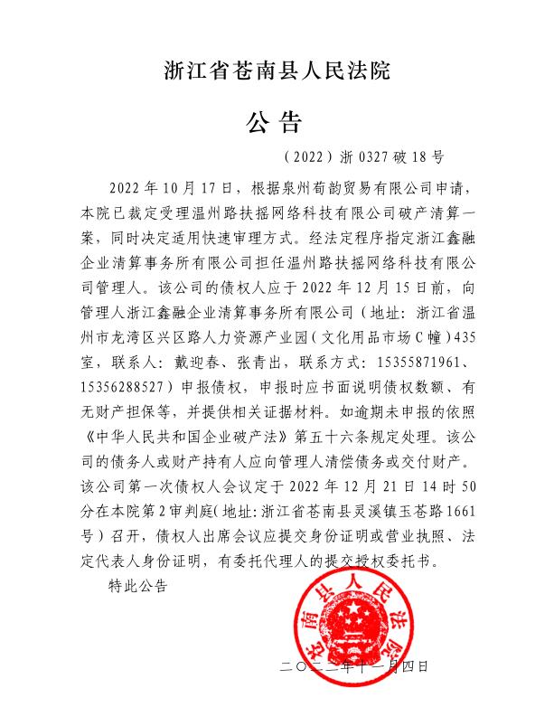 溫州路扶搖網絡科技有限公司破產清算案公告