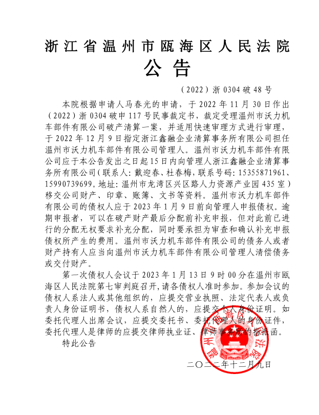 溫州市沃力機車部件有限公司破產清算案公告