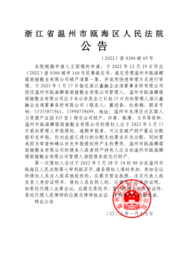 溫州市甌海娜塔麗婭鞋業有限公司破產清算案公告