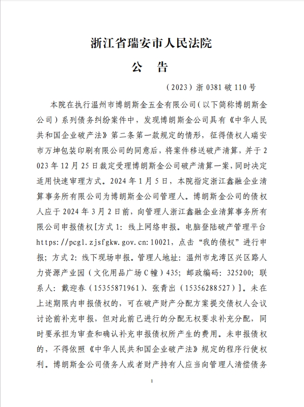 溫州市博朗斯金五金有限公司破產清算公告