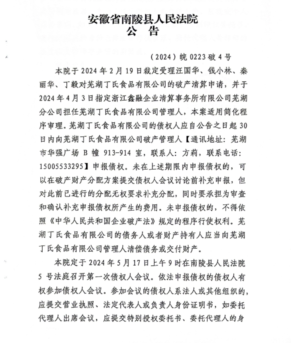 蕪湖丁氏食品有限公司破產清算案公告