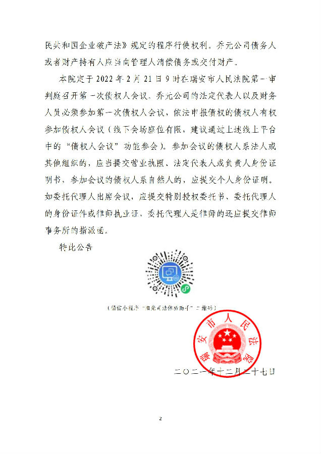 溫州喬元建筑有限公司破產清算案公告