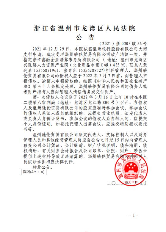 溫州馳倫貿易有限公司破產清算案公告